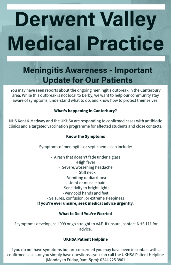 You may have seen reports about the ongoing meningitis outbreak in the Canterbury area. While this outbreak is not local to Derby, we want to help our community stay aware of symptoms, understand what to do, and know how to protect themselves.