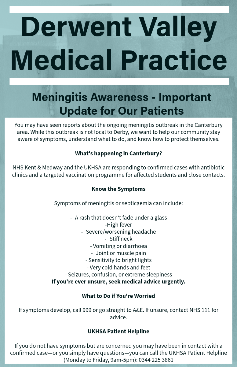 You may have seen reports about the ongoing meningitis outbreak in the Canterbury area. While this outbreak is not local to Derby, we want to help our community stay aware of symptoms, understand what to do, and know how to protect themselves.